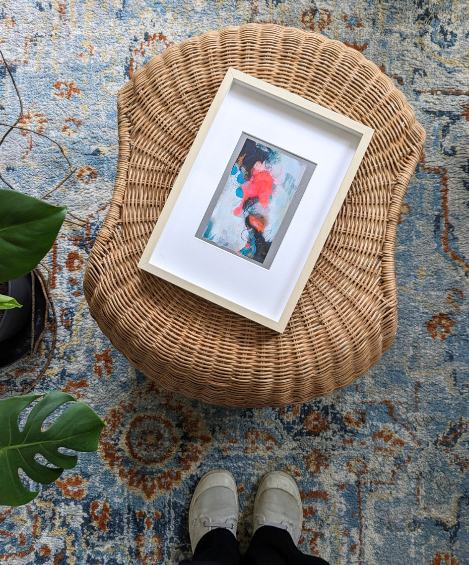 This piece embodies a spirit of playfulness and discovery, rooted in the moment of intuitive creation. Merging the vibrant energy of spray paint, the bold strokes of acrylics, and the delicate caress of soft pastels, every piece encapsulates a distinctive fusion of boldness and softness, vibrancy and sweetness.