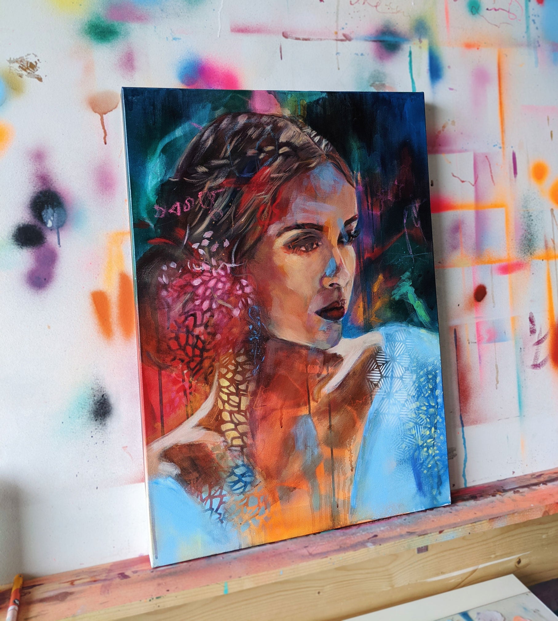 Details: 50x70 cm Original oil and mixed media painting on gallery wrapped canvas.