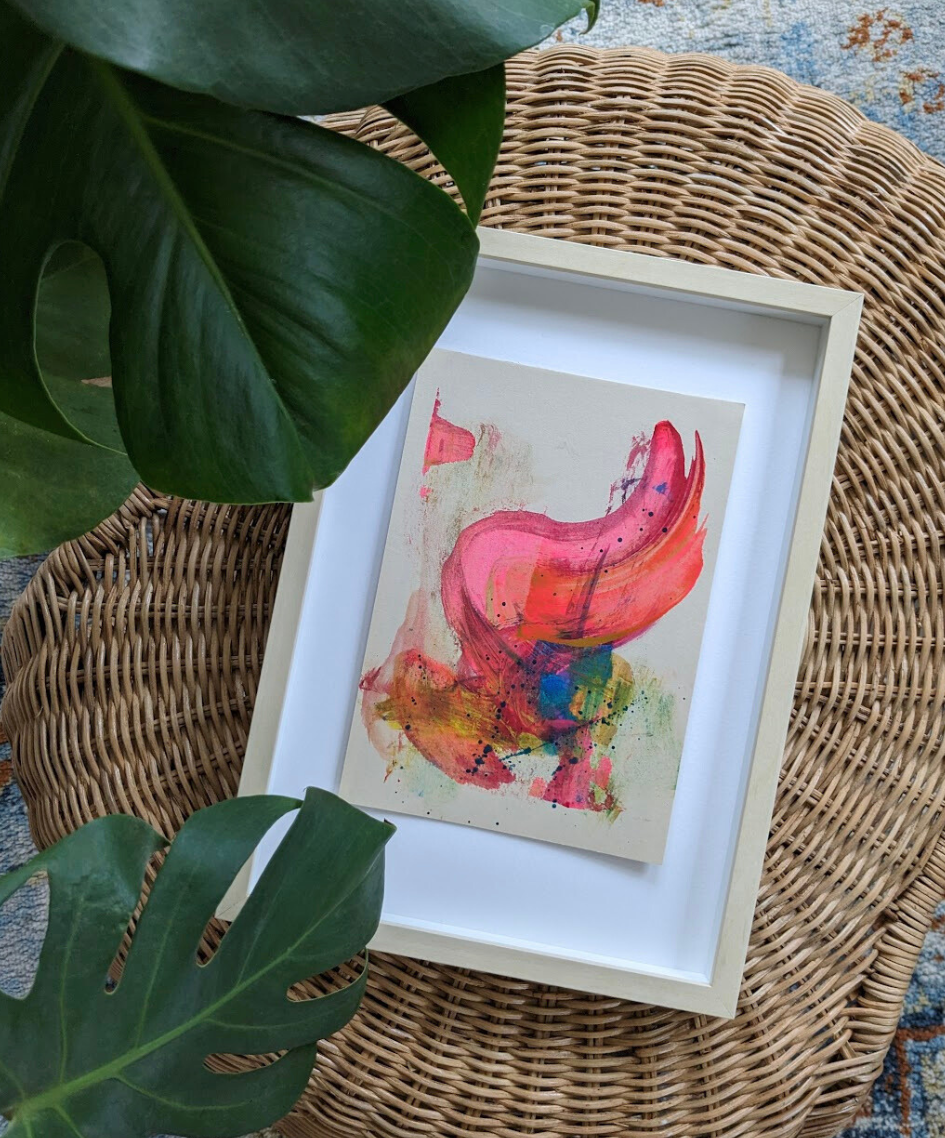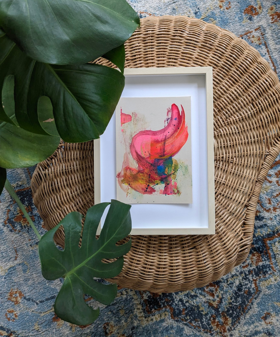 This piece embodies a spirit of playfulness and discovery, rooted in the moment of intuitive creation. Merging the vibrant energy of spray paint, the bold strokes of acrylics, and the delicate caress of soft pastels, every piece encapsulates a distinctive fusion of boldness and softness, vibrancy and sweetness.