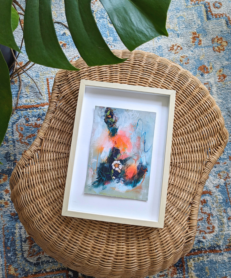 This piece embodies a spirit of playfulness and discovery, rooted in the moment of intuitive creation. Merging the vibrant energy of spray paint, the bold strokes of acrylics, and the delicate caress of soft pastels, every piece encapsulates a distinctive fusion of boldness and softness, vibrancy and sweetness.